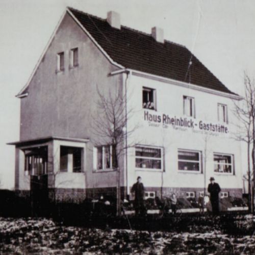 Offenbar florierte die neue Gaststätte, denn am 14. Mai 1937 reichte Ott beim Bürgermeisteramt ein „Konzessions-Erweiterungsgesuch“ ein. Im Absender des Schreibens ist erstmals der Name [extern]„Haus Rheinblick“ angegeben. Ott will wegen der „vielen Ausflügler und Spaziergänger besonders in den Sommermonaten“ zusätzlich eine „Garten-Wirtschaft“ einrichten und wegen der „vielen Ferntransportzüge zu den nahegelegenen Werken der Rheinischen Pappenfabriken AG“ drei Gastzimmer.